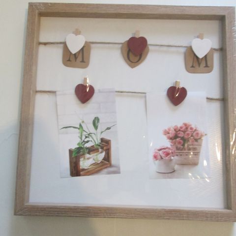 Hauska, metallinen, seinälle ripustettava, valkoinen teline korteille tai valokuville.