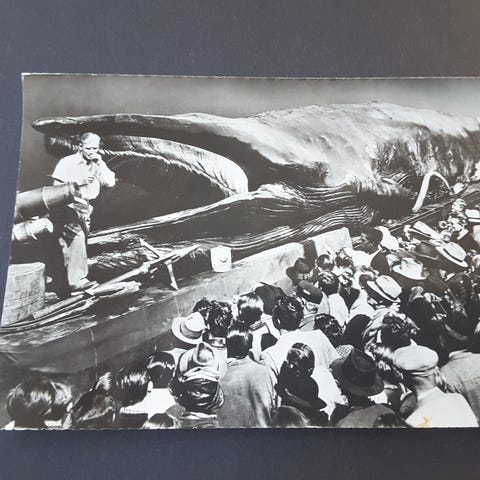 Postikortti jättimäisestä sillivalaasta Goliath. Kansa katsoo valasta. Mukana taitettu noin a4 jossa kerrotaan Goliathin tarina.