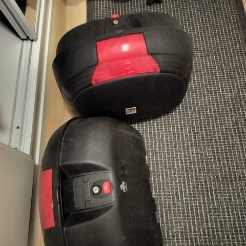 Sivulaukkujen telineet johonki kasaripyörään. Levyt taustalla tukena ja toinen menny joskus poikki (hitsattu).