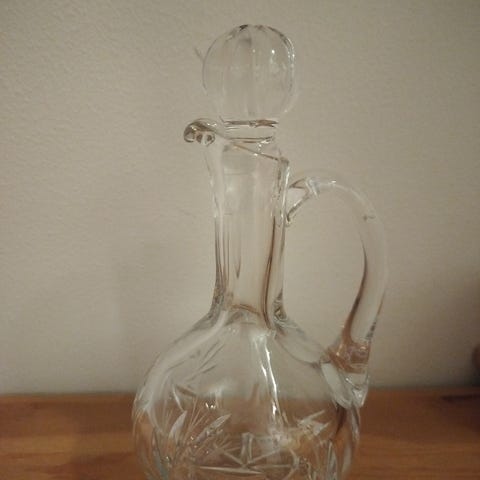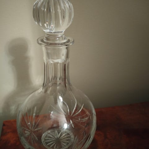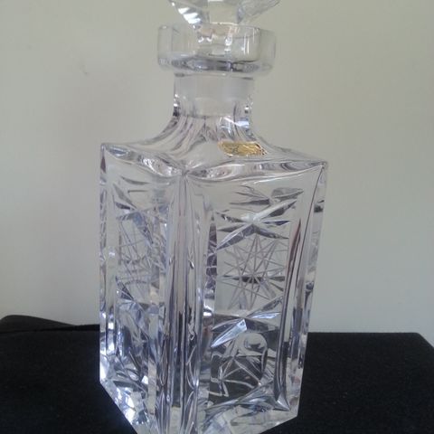 Kristallinen pullo kaunis ja painava kor.30cm ilma korkkista 23cm lev.12 cm pohja-8,5×8,5 cm korkki-9,5cm Vain nouto ja käteinen maksu Vantaa-Pakkala