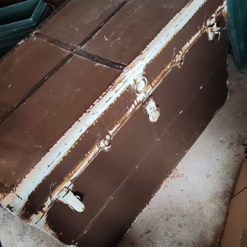 Vanha vielä hyväkuntoinen arkku. Jossain vaiheessa maalattu talonpoikaisrokokoo kalustevärillä. Jotain käytönjälkiä. Yleisvaikutelma siisti. Lukko toimii, mutta ei lukittava.