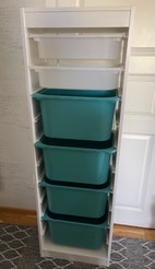 Hyvässä kunnossa oleva Trofast hylly ja laatikot, mitat 46x30x145 cm. Toisessa kyljessä pieni tumma naarmu. Koiratalous. Vain nouto.
