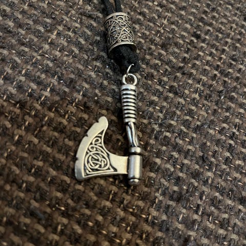 Tyylikäs, vanhan mallin mukaan käsintaottu kaulakoru nauhassa. Riipuksen koko 4,1 x 3,5 cm, nauhan pituus n 65 cm.