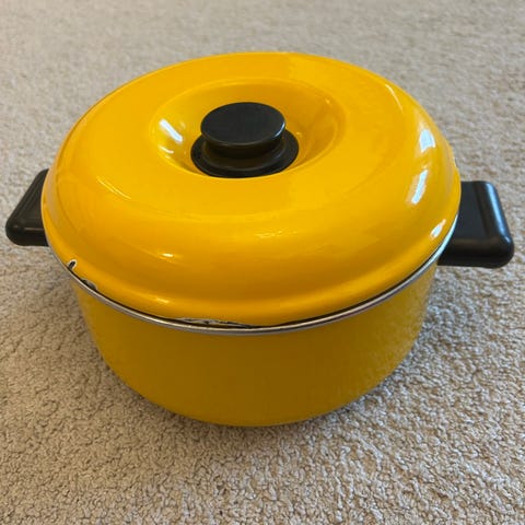 Kuten kuvista näkyy,kansissa on kulumaa,värjäymää ja emalirikkoa paikoitellen. Sisäpinnoissa ei ole niin pahoja kulumia.