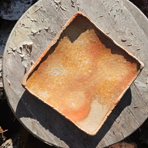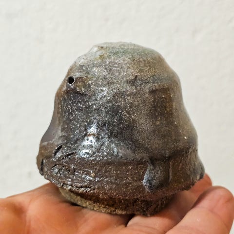 Lasittamatonta Shigaraki - keramiikkaa, jossa runsas luonnonlasite, joka syntynyt puupolton aikana sulaneesta tuhkasta. Tuhkalasite peittää kannen ja suurimman osan astiasta, mutta yksi kylki on paljas, jossa on kauniit polton aikana syntyneet kuviot ja värit.