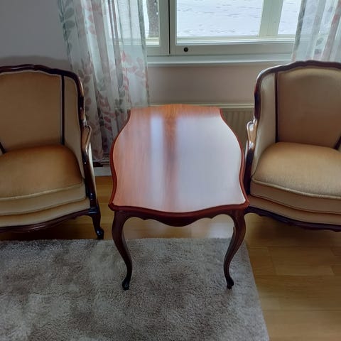 Kauniin vihreäsävyiset sohva ja nojatuolit, hyväkuntoiset. (Pöytä ei myynnissä.)