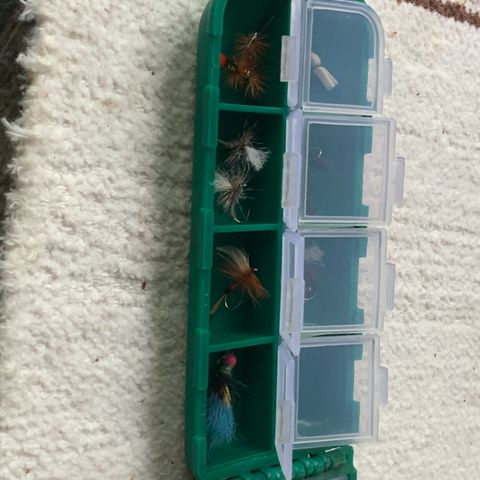 Kätevässä kaksipuolisessa rasiassa 32 kpl pinta Perhoja , tekijänä vuosikymmeniä perhoilua harrastanut innokas perhomies