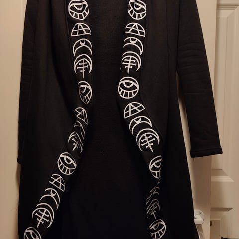 Gootti-tyylinen syyskauden takki. Paljon pentagrammikoristeita vetoketjuissa. Ei ole ollut käytössä lähes ollenkaan, joten kunto on kuin uusi. Koko S