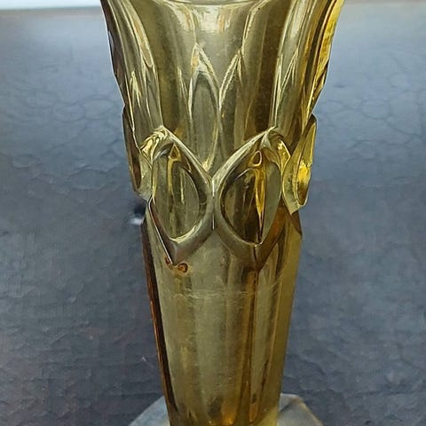 Hieno punainen käsinpuhallettu maljakko. Nettihakujen perusteella ilmeisesti Neuvostoliitossa tai muualla Itä-Euroopassa valmistettu 1960-80-lukujen aikana. Korkeus 23,5 cm, yläosan leveys 9 cm.