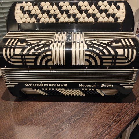 Myydään Kouvola Amerikan malli. Vaatii virityksen, yksi kosketin puuttuu. Neljä äänikertaa, vaihtaja kahvan takana violin/master. Maalauksen alkuperäisyydestä en osaa sanoa. Pystyy kyllä soittamaan mutta epävireessä. Palkeet kohtuullisessa kunnossa. Mielellään näistä jotain ymmärtävälle, vaatii kunnostusta. Vain nouto. Alkuperäistä laatikkoa ei ole.