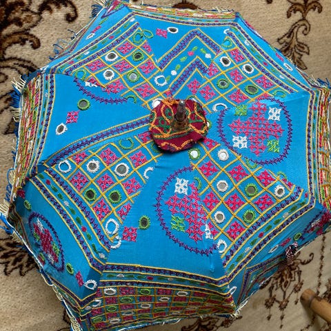 Myydään takkahuoneessa koristeena ollut bambu/banaanipuinen aurinkovarjo. Halkaisija 200cm ja korkeus jalan kanssa 220cm. Betonijalan ja valot saa halutessa mukaan (ks. kuvat). Vain nouto ja maksu mobilepaylla.