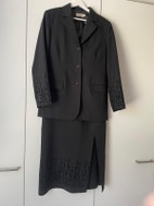 Musta, Moreland jakkupuku-kokonaisuus. Hihoissa ja hameen helmassa upeat paino"aplikoinnit". Hameosassa tyylikkyyttä tuo halkio.