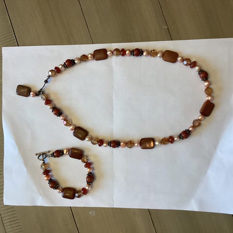Myytävänä uusi kaulakoru ja rannekoru koristekivin Espanjasta. Rannekorun pituus reilut 19 cm, kaulakorun pituus n. 53 cm.