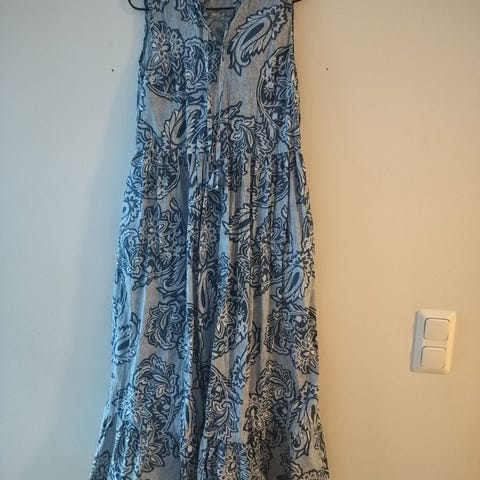 Naisellinen kevyt sininen eläinaiheinen kesämekko.