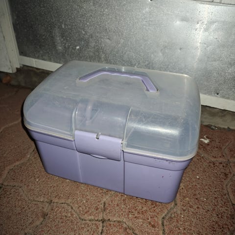 Vanha harjalaatikko. Väri kulunut, violetin sävyinen. Lukitus toimii hieman hassusti mutta toimii kuitenkin. Väliseinä sisällä, saa irroitettua jos haluaa.