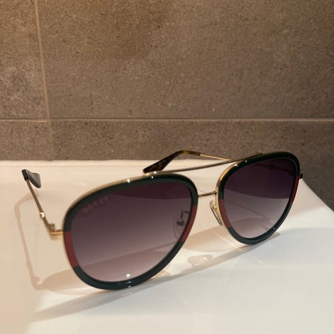 MCM- aurinkolasit, joissa kullanvärinen logo sangoissa.