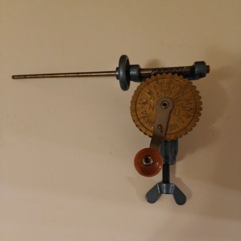 Siistikuntoinen metallinen puolauskone etsii uutta kotia. Kiinnitysmekanismin avulla puolauskone voidaan kiinnittää esimerkiksi pöytään.