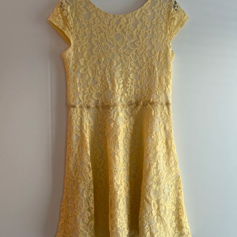 Tyttöjen luonnonvalkoinen/kermanvärinen pitsimekko joustavaa materiaalia, koko xxs/xs/158cm. Koko-ja tuotelaput valitettavasti leikattu pois häiritsemästä. Vuorillinen, toisessa sivussa piilovetoketju. Kainalosta kainaloon mitta 35cm. Pituus olalta helmaan n.78cm.