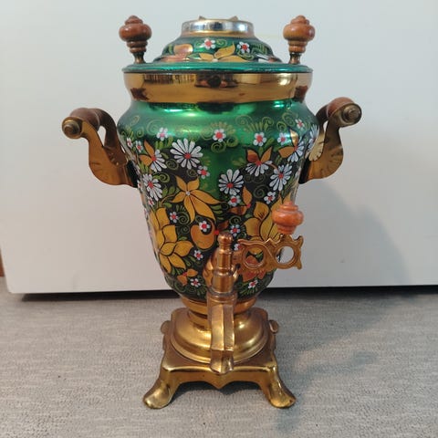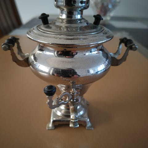 Hopeanvärinen samovaari, korkeus kannen kanssa noin 30 cm, leveys kahvojen kanssa noin 27 cm. Ostettu Moskovasta. Pohjassa leimoja, mm. vuosiluku 1986, sähköjohto mukana, maadoittamaton pistotulppa. Olen käyttänyt koristeena, en ole keittänyt tällä vettä. Haku tai lähetys, ostaja maksaa postimaksun.