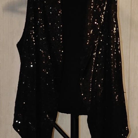 Paljetti-ja helmikirjailtu samettiliivi, koko n.S-M, Pituus olalta helmaan 49cm, kainalosta kainaloon mitta 43cm.