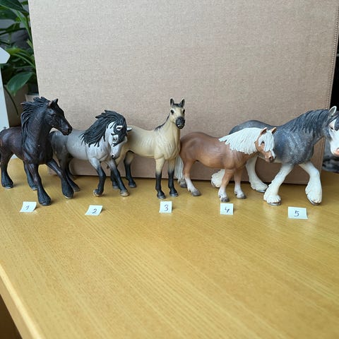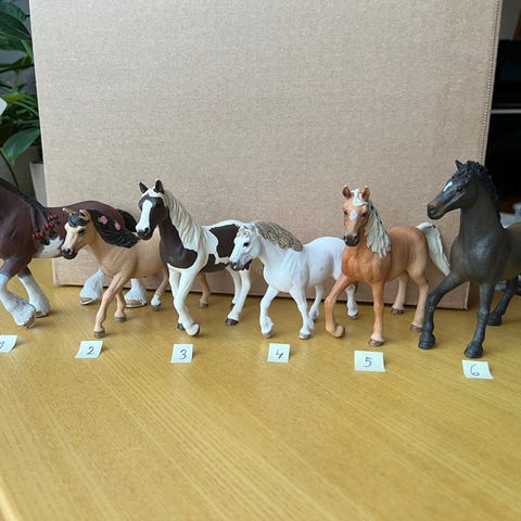 Tosi hyväkuntoiset hevoset: Schleich pinto ori ja toinen vähän pienempi heppa (merkistä ei tietoa), jolla harjattavat jouhet. Pienemmän hepan päässä oleva "riimu" on pieni kumilenksu. 😁