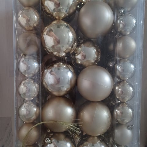 Iso määrä hopean, kullan ja vaaleanpunaisen hohtoisia joulupalloja. Itsellä oli ajatus tehdä näistä näyttävä kranssi juhlaan. Pallot ovat kuvassa isossa Bilteman kassissa, eli paljon.