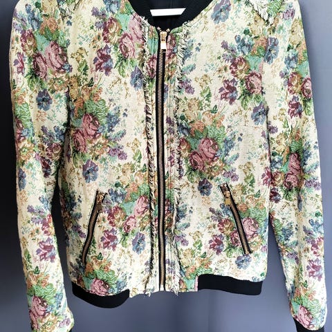 Käyttämätön kukallinen bomber-takki. Vetoketju edessä, sivuilla taskut.