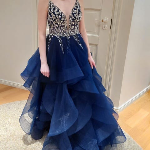 Mekko on käynyt myös pesulassa eikä siinä ole likaa tai tahroja. En käyttänyt tanssi päivänä itseruskettavaa! Olen itse noin 162cm pitkä ja tanssin noin 5,5cm korkeilla koroilla. Mekon mukana tulee pukupussi sekä vannehame. Hinnasta voidaan myös neuvotella, joten rohkeasti kyselemään!😊