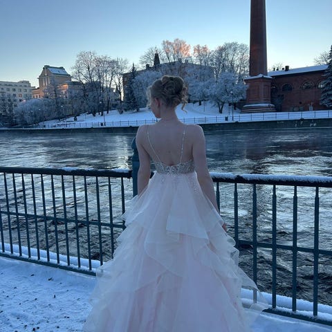 Vaalean violetti vanhojentanssimekko, joka on alunperin ollut kokoa 36, mutta kavennettu kokoon 32. Selässä olevan nyörityksen ansiosta mekko sopii useammalle, kuin yhdelle koolle ja vartalolle. Sanoisin mekon istuvan ainakin 30-34 kokoiselle.