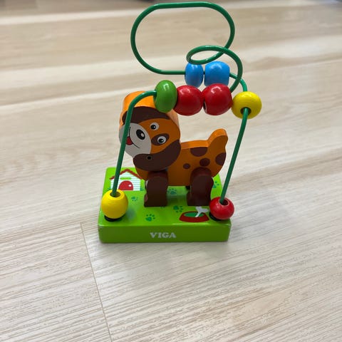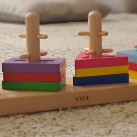 Puinen kuutio sisältää viisi eri aktiviteettia vauvasta taaperoon. Palikoista osa tallessa.