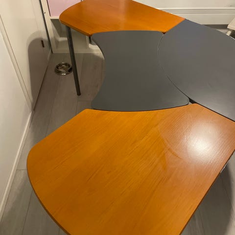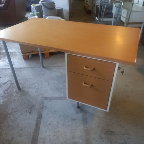 Ruskea työpöytä jossa avattava kansi ja säilytystila. Kannen sisäpuolelle saa kiinnitettyä nuppineulalla asioita. Kannessa jonkin verran jälkiä. Irroitettavat jalat. Vain nouto Pihlavasta.