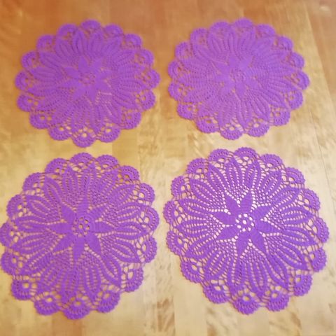Uudet käsin virkatut lilat liinat. Halkaisija n. 24 cm ja 100 % puuvillaa.