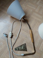 Vanha vintage seinävalaisin, messinkiä ja teakia, alkuperäisen varjostimen saa mukaan. Valaisinta voi liikuttaa puolelta toiselle seinätelineessä ja varressa on taivuteltava osa valon suuntaamista varten, joten valaisinta voi käyttää monipuolisesti. Vaakatasoisen varren kiinteä osa on 28 cm pitkä ja taivuteltava osa on 16 cm. Valaisin on ollut seinällä kahden pöydän tai sängyn ja pöydän välissä ja käännelty kulloinkin tarvittavaan suuntaan. Polttimon kanta E27. Kaunis ja harvinainen valaisin!