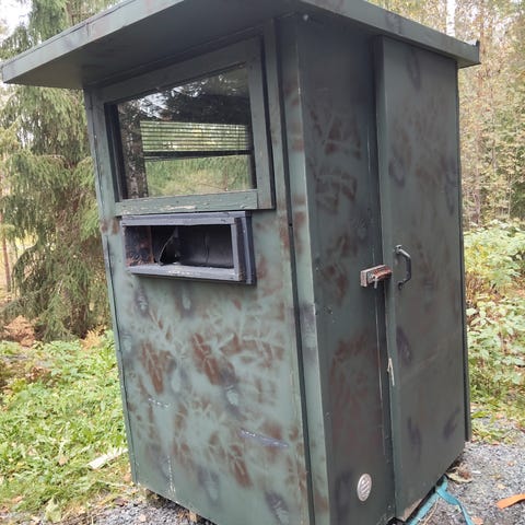 Yhdellä ampumaluukulla eteen päin. Ampumaluukku pleksiä. Oikealla sivulla myös ikkuna. Laadukkaat ja eristävät ikkunat. Kunnon ulko-ovi. Hyvä seisomakorkeus sisällä.
