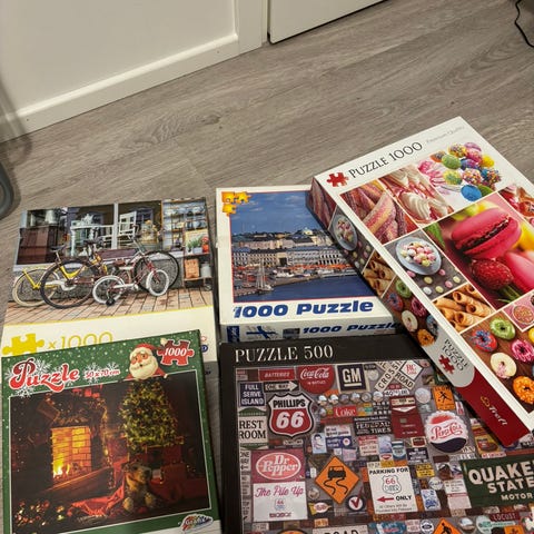 Kaikki palapelit kerran tehty. Joulupalapelista puuttuu yksi pala, muuten kaikki palat tallessa.