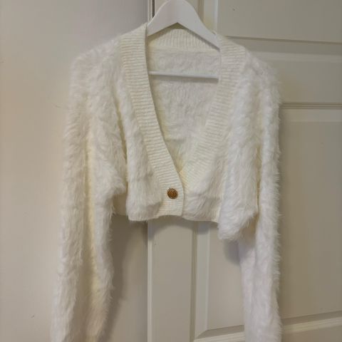 Tummansininen pörröneuletakki, jossa edessä kiinnitys hakasella. Edessä molemmin puolin taskut. Pidempi takapuolen peittävä malli. Laput poistettu, mutta noin kokoa M. Neulos myös joustaa jonkin verran.