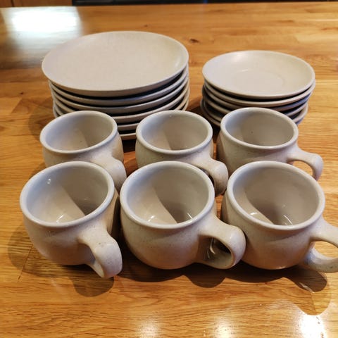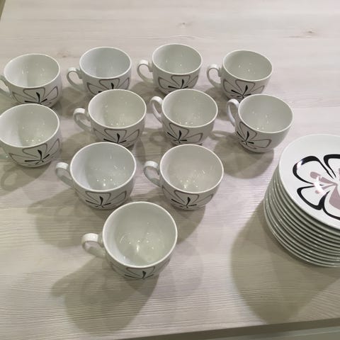 Salsalainen kahviastiasto. 10 kuppia. 11 aluslautasta. 13 pullalautasta.
