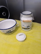 Lasten pottu emalinem kuviollinen hauskoja ihan uusi, ei ole käytetty, myös maito kannu sama sarja emalinen.Kannu mitat- kor