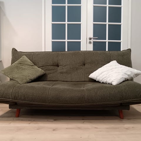 Sininen sohva. Haalistunut ja joitain tahroja. Ihan ok istua. Runko tukeva