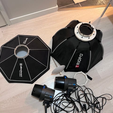 Mukana paljon lisätarvikkeita ja valonmuokkaimia (mm. softbox).