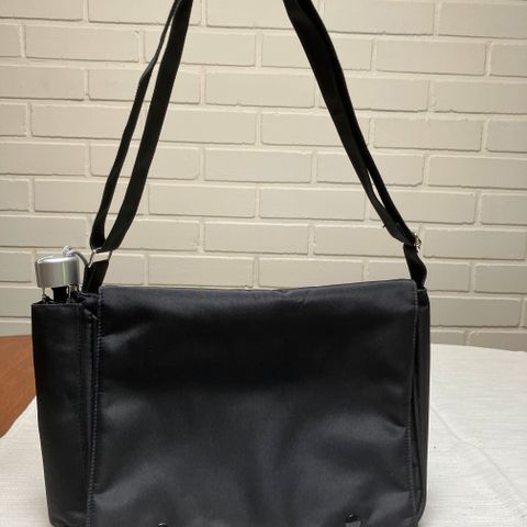 Bozzini musta kangaslaukku. Vetoketjusuljenta päällä. Sisällä sekä ulkopuolella vetoketjutaskut. Nylon-kangasvuori. Leveys ylhäältä 37 cm, pohjasta 42 cm, korkeus 37 cm. Säädettävä hihna, lyhimmilleen säädettynä (kuten kuvassa) 68 cm. Menee myös yli olan. Huom! Laukku on pikimusta, jotkut kuvat ylivalottuneet. Moitteeton kunto.