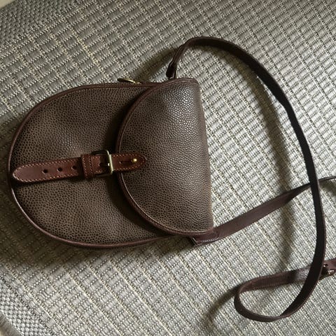 Laukku on viimeistely konjakinruskealla nahalla ja messinkiset metalliosat antavat tyylikkään ilmeen. Sisällä vetoketjullinen sisätasku arvoesineille. Säädettävä olkahihna.