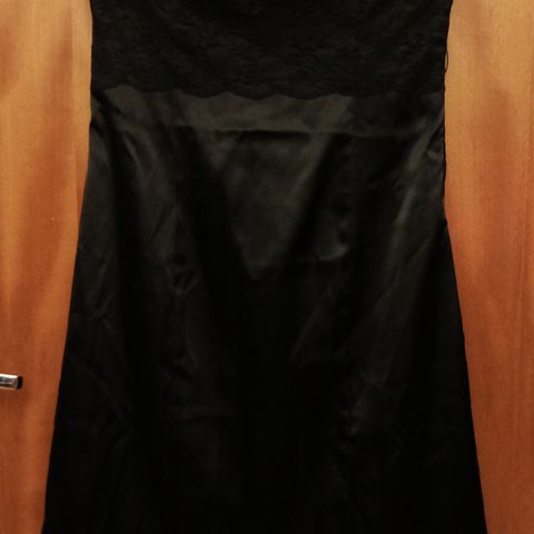 Näyttävä uusi musta satiinimekko. Kauniit näyttävät leikkaukset. Koko UK 14 (EU 40). Merkki F&F. Takana vetoketju ja hakanen. Yläreunassa silikoninauha. Edessä rintojen kohdalla pystytuet ryhtiä antamassa. Mekossa on vuori Materiaali päällinen 86 % polyesteri, 4 % elastaani, vuori 100 % polyesteri. Uusi, laput kiinni.