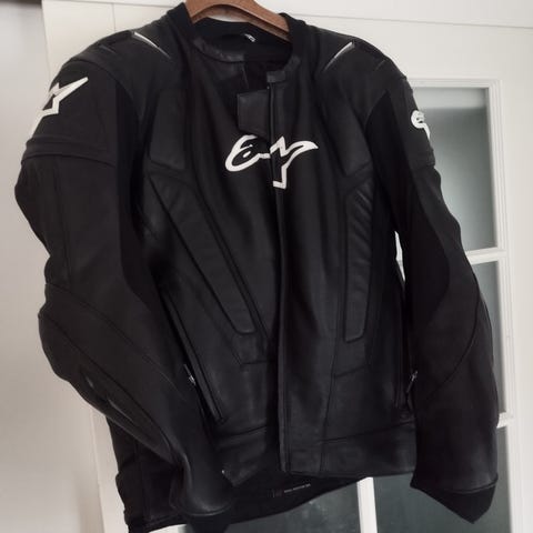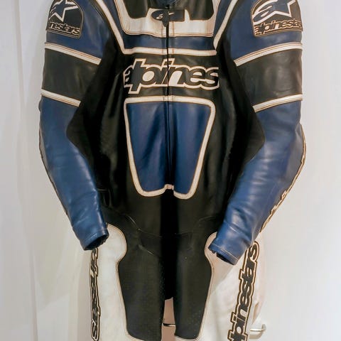 Käytön jälkiä, mutta ehjät nahkat ja vetoketjut. Hieno ja tyylikäs ratapuku.