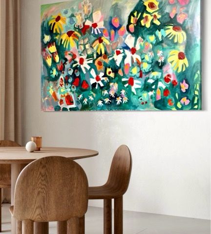 Tämä vaikuttava 150 x 100 cm akryylimaalaus esittelee jättimäiset, rohkeat kukat, jotka tuovat tilaan elinvoimaa ja energiaa.