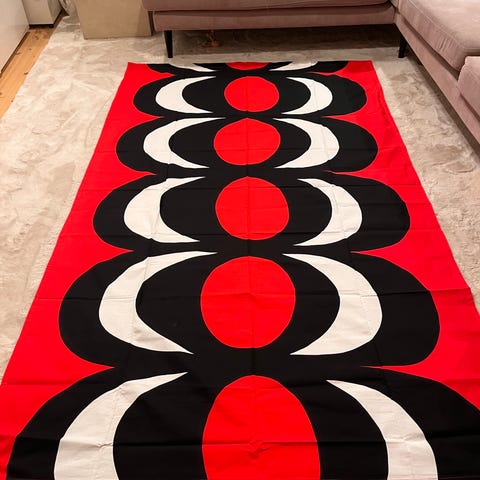 Siistikuntoiset, värit säilyneet erittäin hyvin ja kangas todella tukevaa. Verhot ommeltu joka sivulta. Väreinä punainen, musta ja valkoinen.