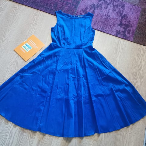Lontoossa tehty Lady Vintage Hepburn-kellomekko upealla liljakuosilla. Pohja tumma sinivioletti. Materiaali on 97 % puuvillaa ja 3 % elastaania, eli joustaa ja on mukava päällä. Muotoleikkaukset, takana pitkä vetoketju ja vyötäröllä leveä, musta silkkinauha. Kunto täysin uutta vastaava, ei eläintalous. Koko S: kai-kai 43 cm, vyötärönympärys 71 cm, olka-helma 106 cm. Käytä tyllihameen kanssa tai ilman. MMM