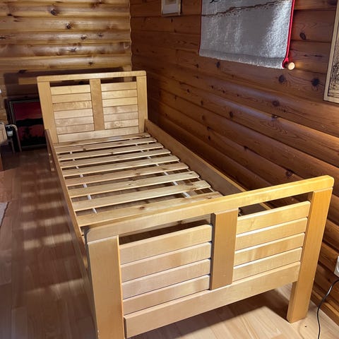 Tästä tolkku sänky lapselle. 80 leveä (patja 75 cm (ei mukana), pituuden voi säätää välille 110-195cm. Menee kahteen osaan (päädyn kork 82cm)