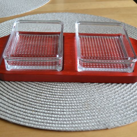 Karl Holmbergin harvinaiset tarjoiluastiat 1960-luvulta. Petsattuihin tarjottimiin istutetut lasikulhot. Toinen kulhoista on kirkas, toinen savuinen liila.