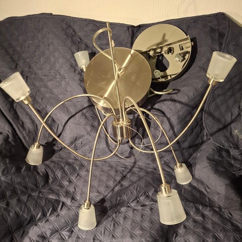 Kromin väriset lampunvarjostimet yksi iso Lampun halkaisija 40 cm, korkeus 37 cm, lamppu E27 maks 60 W. lisäksi samaa sarjaa 2 pientä valaisinta. Pienten halkaisija 15 cm. Kaikki yhteensä 40e sisältää lamput .